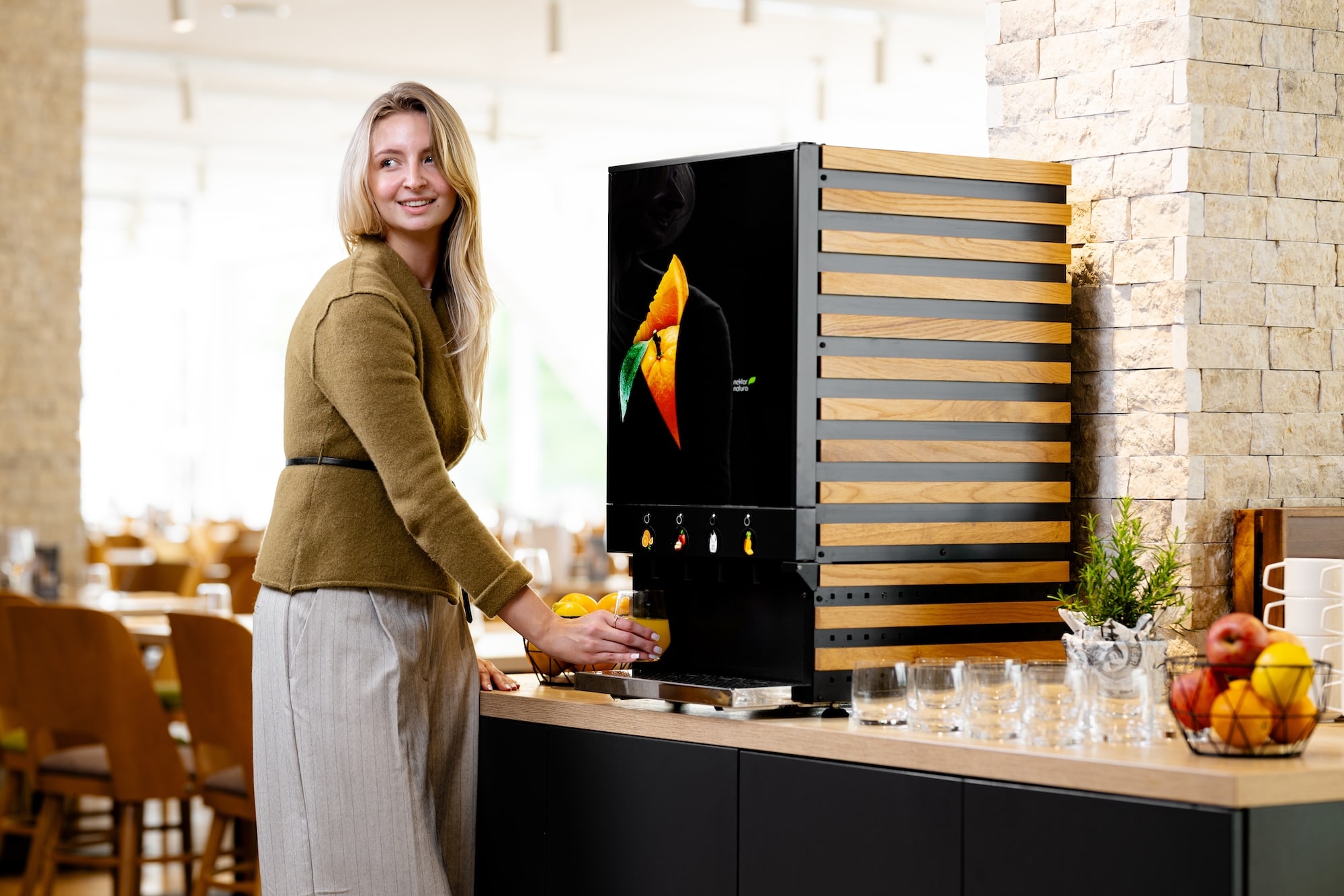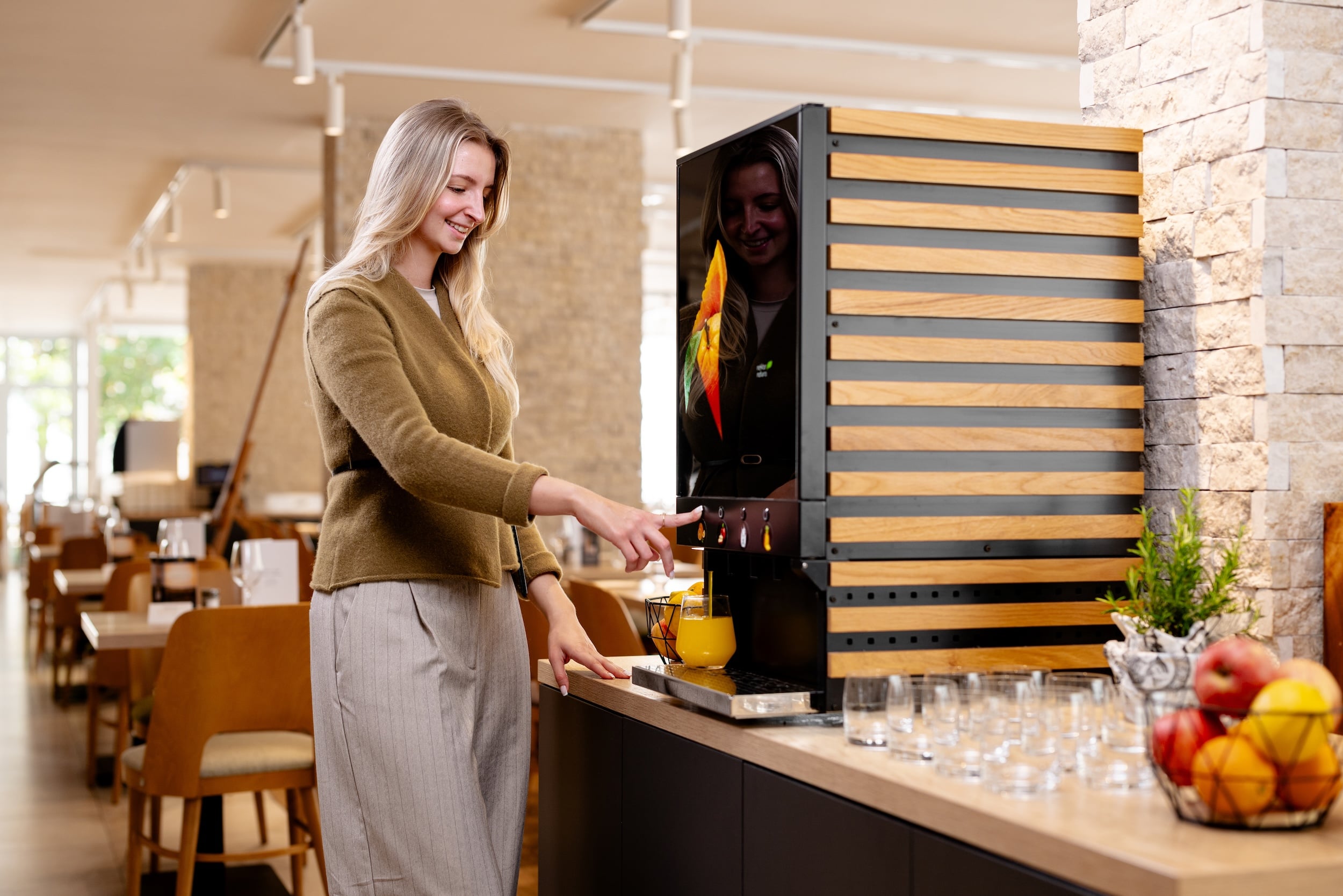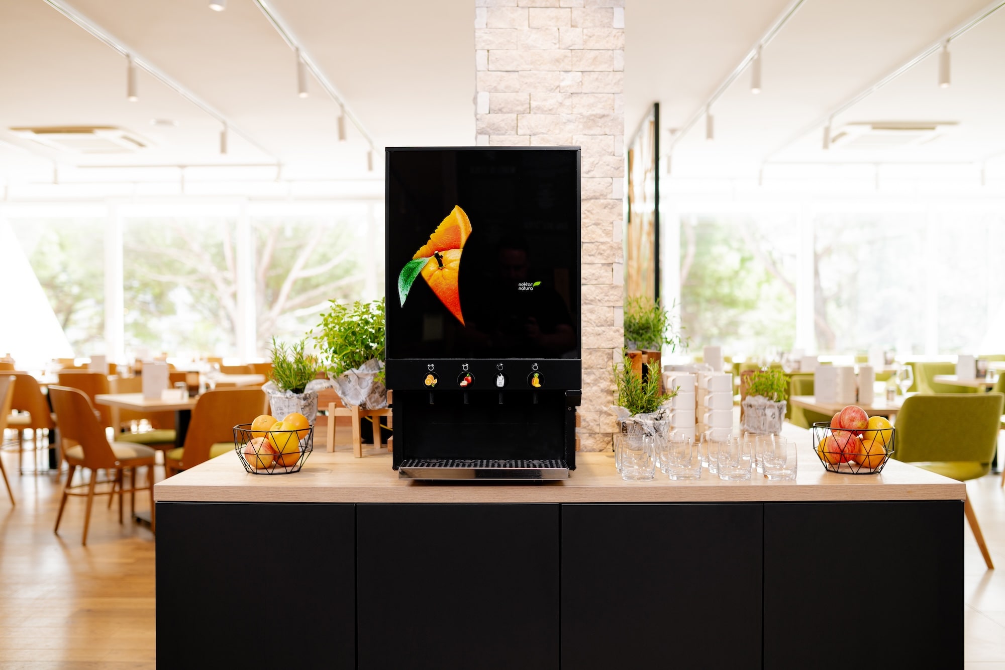 Conçu pour une utilisation polyvalente, il elle convient aux environnements tels que les buffets de petit-déjeuner ou les comptoirs libre-service. Utilisant des jus concentrés et de l’eau fraîche, il minimise les déchets et les besoins de stockage tout en restant écologique et efficace.